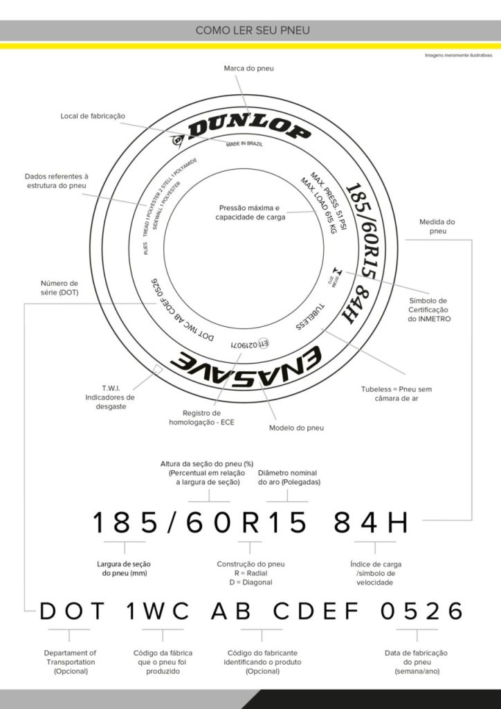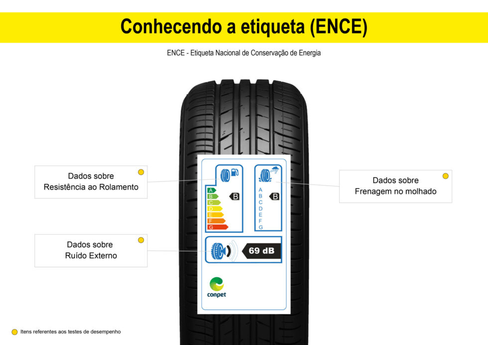Desde 2012, pneus vendidos no Brasil devem exibir a Etiqueta Nacional de Conservação de Energia (ENCE), regulamentada pelo Inmetro. A classificação avalia três critérios: resistência ao rolamento (de A a E, sendo A mais eficiente e com menor consumo de combustível), aderência em piso molhado (também de A a E, impactando diretamente na frenagem em dias de chuva) e ruído externo, medido em decibéis (dB).