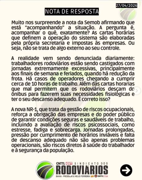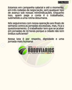 A nota também destaca condições de trabalho consideradas críticas. De acordo com o sindicato, rodoviários vêm sendo submetidos a jornadas extensas, especialmente aos finais de semana e feriados, quando há redução de frota. Há relatos de operadores cumprindo cerca de 10 horas de trabalho, além de dificuldades para pausas básicas durante o expediente.